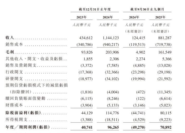 公司于2023年、2024年、2025年截至9月30日止九个月,收入分别约为4.35亿元、11.44亿元、8.81亿元人民币。