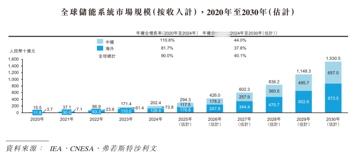 全球储能系统市场规模由2020年的人民币155亿元扩增至2024年的人民币2024亿元,年复合增长率达90.0%,并预计于持续的政策激励、系统成本下降及部署增加的支持下,于2030年达到人民币15305亿元,自2024年起年复合增长率约为40.1%。