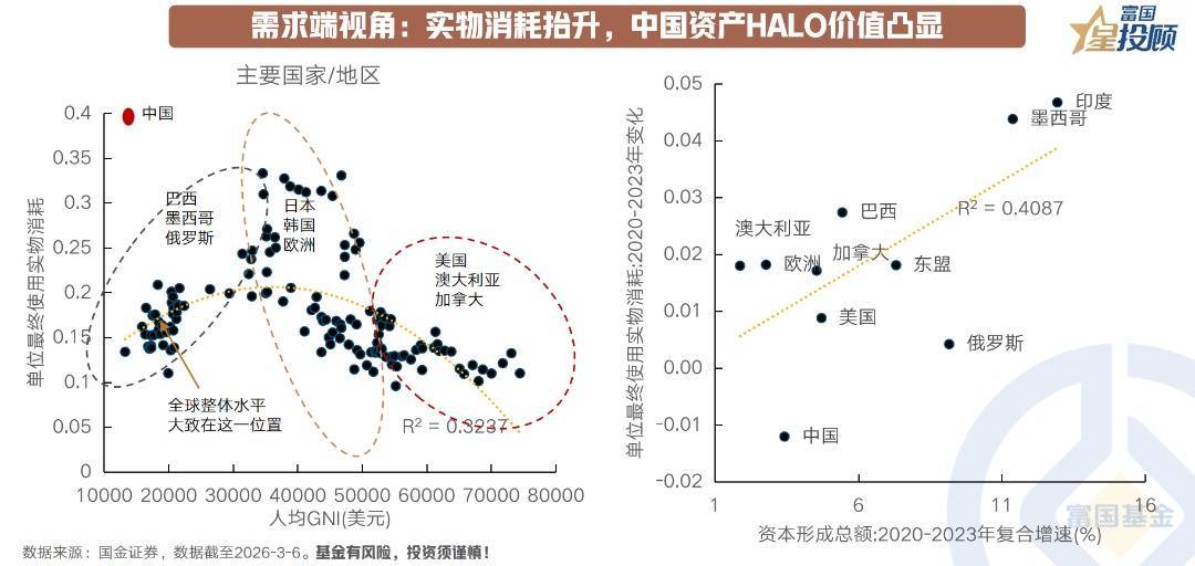 从全球实物资源需求视角审视,中国资产在HALO投资范式下或具独特价值。当前中国单位最终使用对应的实物消耗规模显著领先全球其他主要经济体,随着中国国民总收入(GNI)的增长与资本开支的扩张,实物消耗增长仍具潜力。往后看,全球制造业产能重构、AI产业扩张带动的全球资本开支增速上行等将从需求侧形成对实物消耗的长期拉动,而中国具备全球最完整的制造业体系、庞大的基础设施存量与领先的资源品产能布局,在HALO投资叙事下更显独特价值。