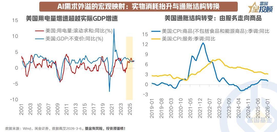 人工智能浪潮的影响正持续外延至现实世界。一方面,AI算力需求爆发式增长的实物消耗正系统性抬升。以电力系统为例,2024年以来,美国用电量增速持续上行并超越实际GDP增速,这正是数据中心耗电量激增的直观反映。AI的规模化应用不仅对电力需求总量提升,更对电力供应的稳定性、密度及绿色化提出更高要求,堪称AI对传统能源体系的赋能与重构。另一方面,实物消耗的上升正推动全球通胀结构性转换。过去两年,通胀因素更多地与供应链扰动及服务消费复苏相关,未来,AI驱动的实物商品需求可能在通胀构成中扮演更重要的角色。
