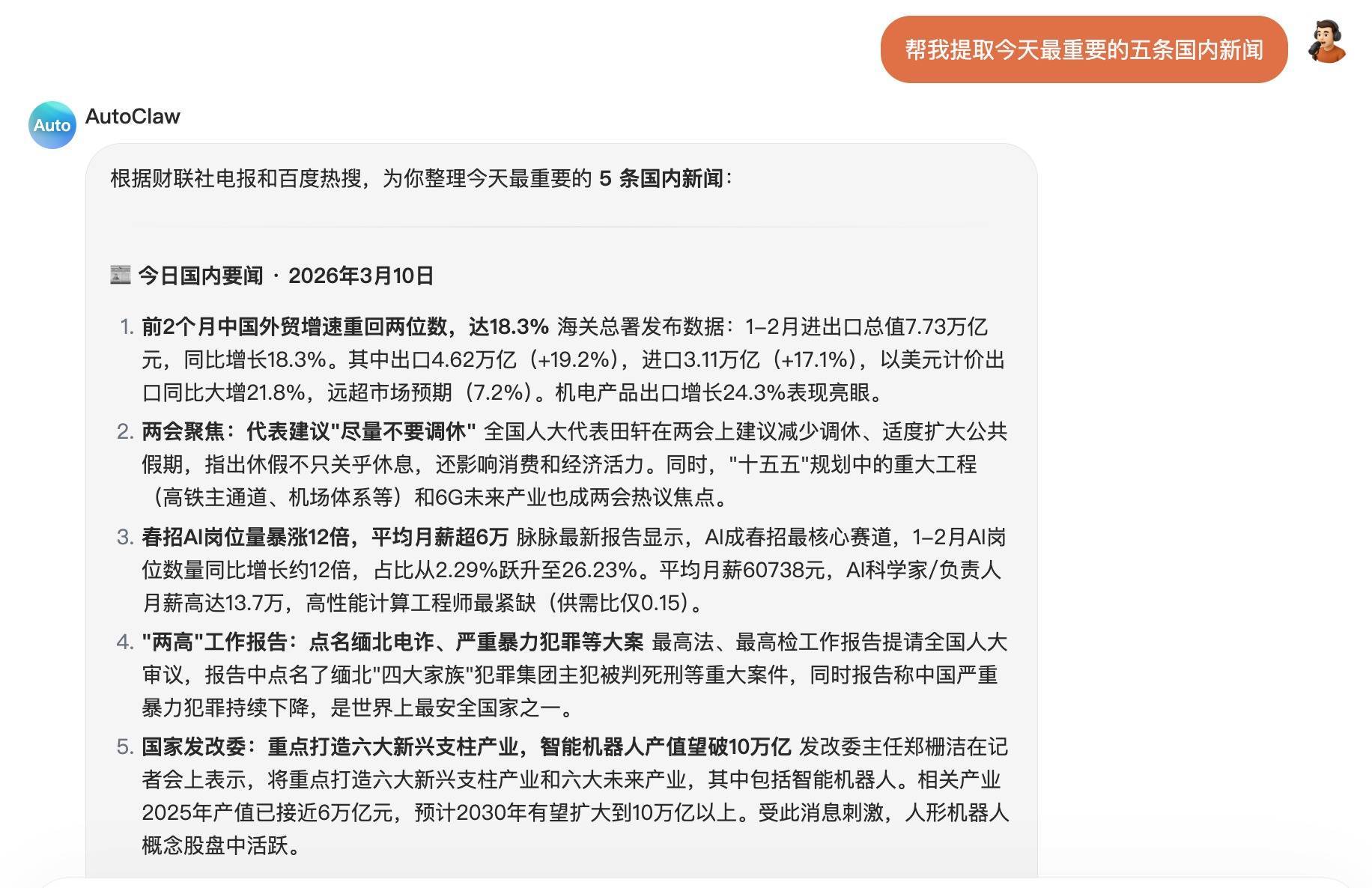 智东西第一时间体验了AutoClaw,发现在像下载App一样下载完AutoClaw之后,1分钟简单配置后,我就可以通过对话方式让AutoClaw为我干活。如下图所示,我让其“帮我提取今天最重要的五条国内新闻”,其在一分钟之内给出了这些新闻,消耗了39个免费积分。